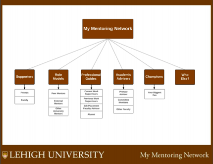 Graduate students should seek out ad establish a network of people who can help them reach their goals. The Mentoring Network graphic offers suggestions on who graduate studetns should being into their circle.