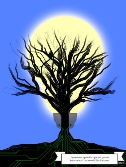 My research focuses on applications of semiconductor devices including LEDs which gave me the idea of designing something around a light bulb and electronics. The roots of the tree power the lightbulb which provides the light for the tree to grow. Overall, I wanted the picture to symbolize the unnoticed hard work that graduate students achieve(the roots) and how this unnoticed work is the foundation for success and growth(the light and the seen part of the tree growing).