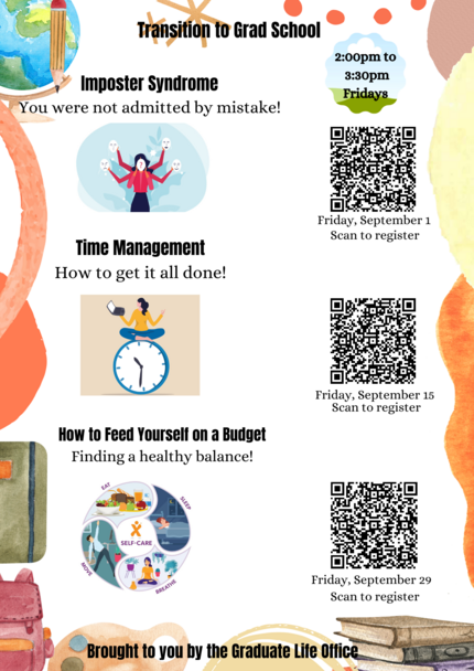 2:00pm - Register here for Time Management with Assistant Director for Graduate Life, Kirsten Sneeringer.